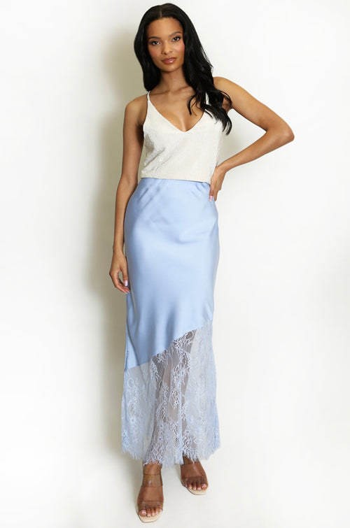 (PRE-ORDER) arriving next week Blue Asymmetric Lace Hem Satin Skirts