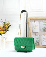 Cross Body Handbag with chevron quilted pattern, flap over cover with rectangle twist turn lock and golden metal chain.