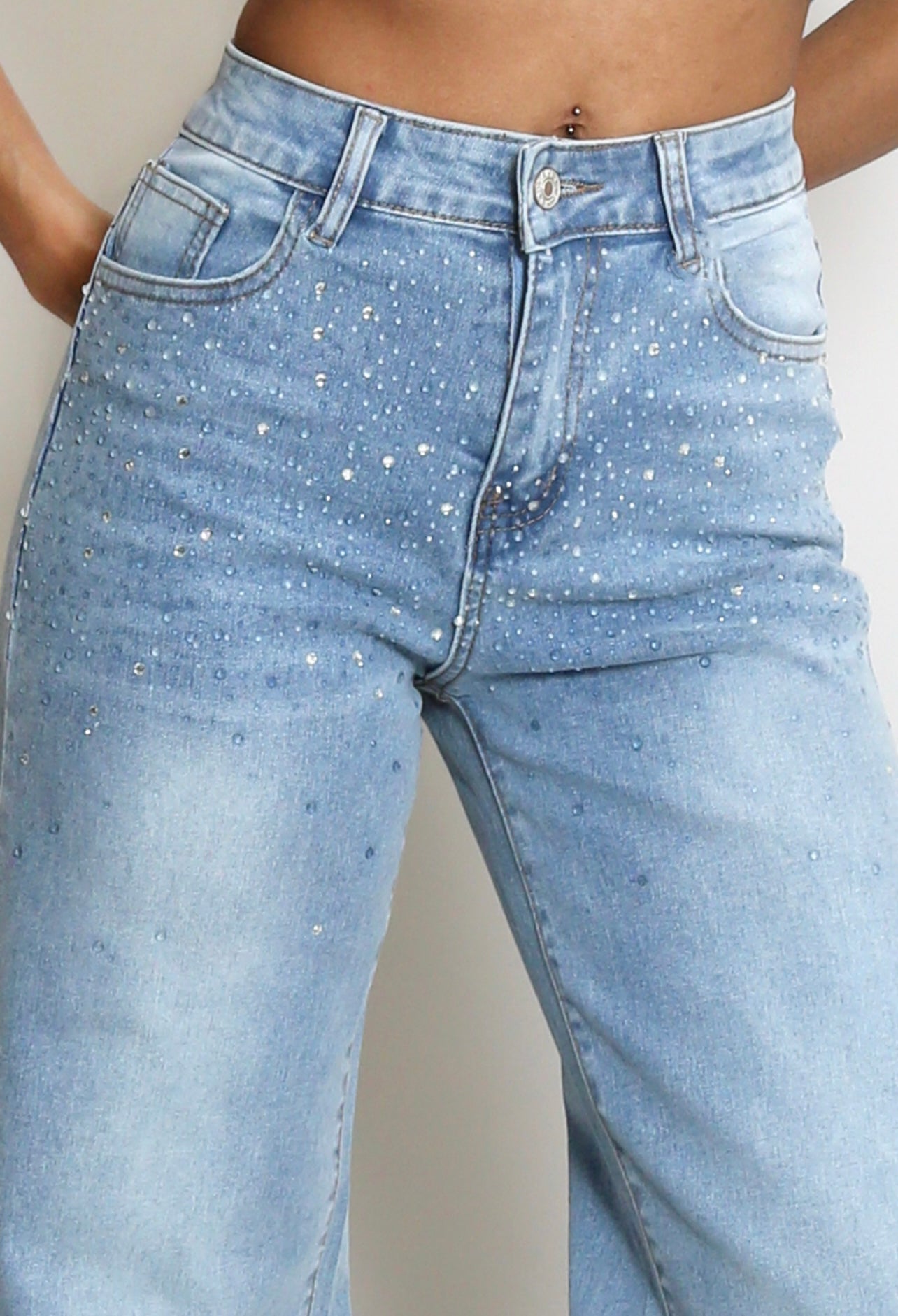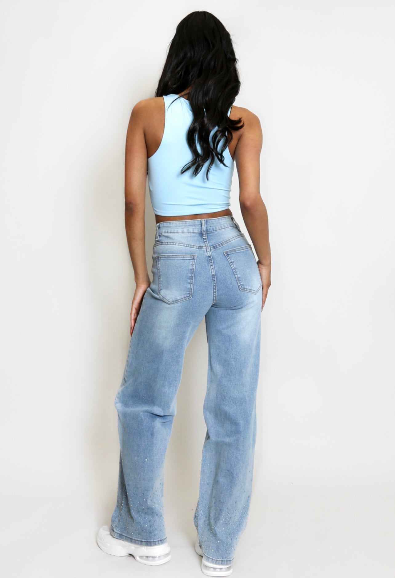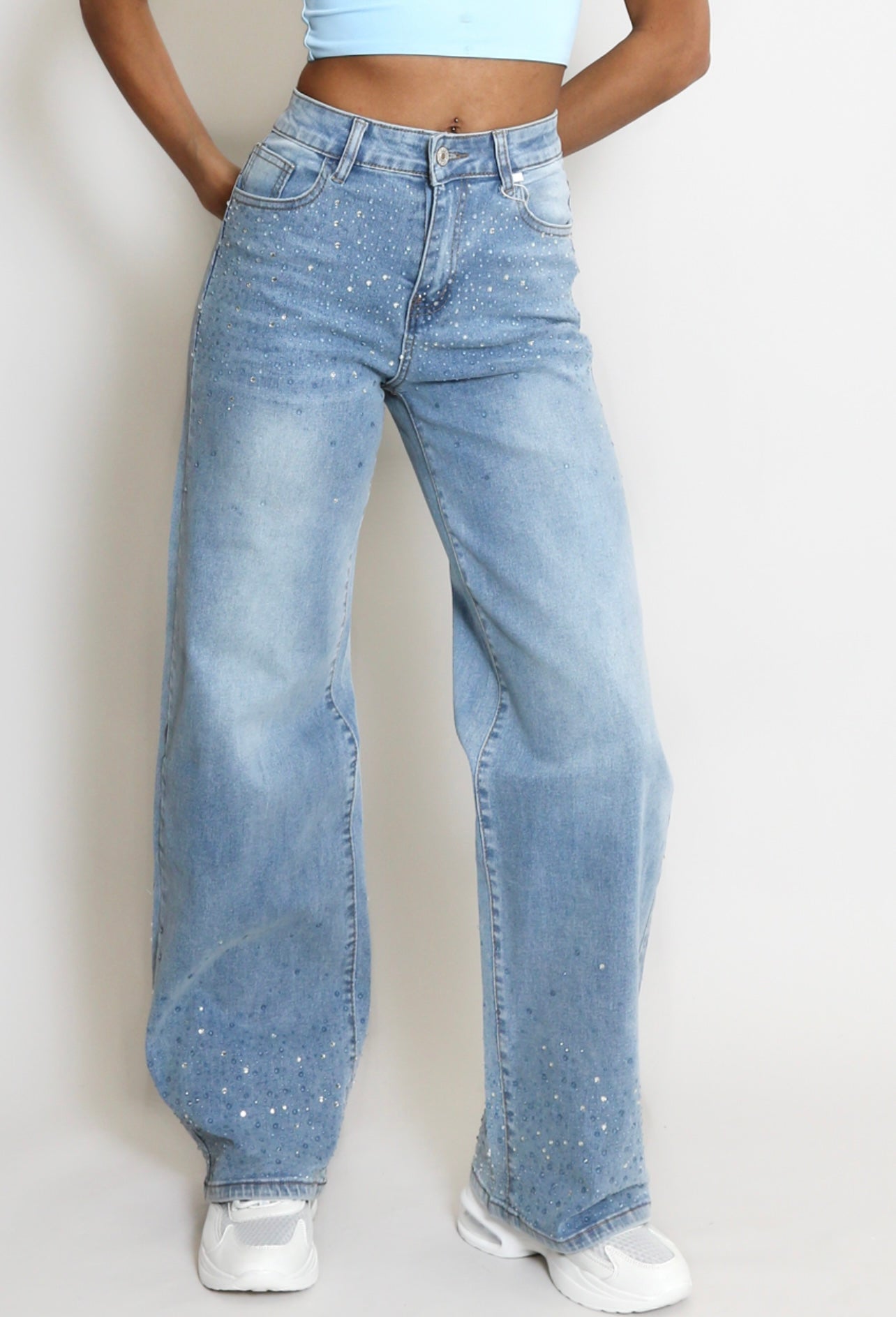 Studs Trim Wide Leg Denim Jeans