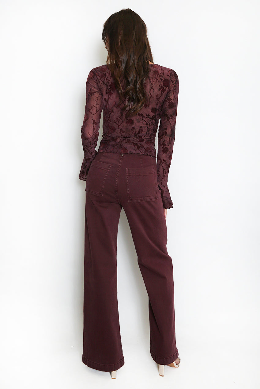Wine Floral Embroidered Sheer Flare Cuff Top